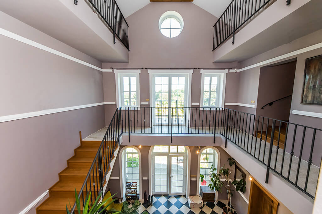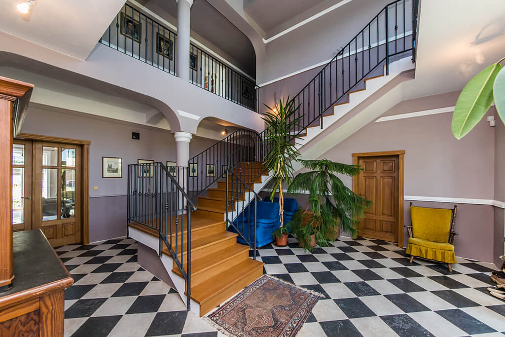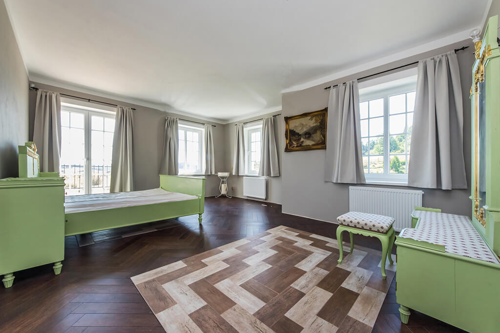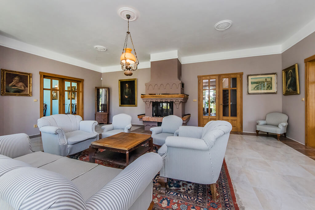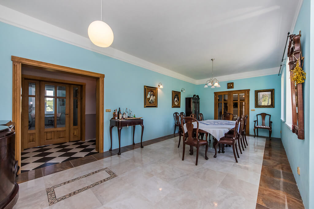 Každá místnost je promyšlená do posledního detailu – od reprezentativního salonu přes prostornou jídelnu až po soukromé části s nádechem starých časů. Interiér byl navržen tak, aby umožnil jak pohodlné rodinné bydlení, tak prestižní společenské události. Atmosféru dotváří krby, oblouková okna s výhledem do krajiny a pocit nadčasové elegance, který se v moderních domech hledá jen těžko.