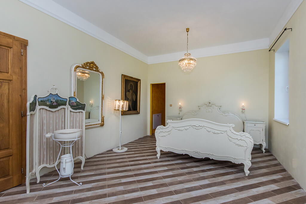 Za vstupními dveřmi se otevírá interiér, který propojuje noblesu zámeckého stylu s komfortem moderního bydlení. Vysoké stropy, dekorativní římsy a masivní dřevěné prvky vytvářejí atmosféru důstojnosti a klidu. Prosvětlené prostory navozují dojem vzdušnosti, zatímco pečlivě volené materiály – kámen, dřevo, kované detaily – odkazují na tradiční řemeslnou práci a dávají prostoru nezaměnitelný charakter.